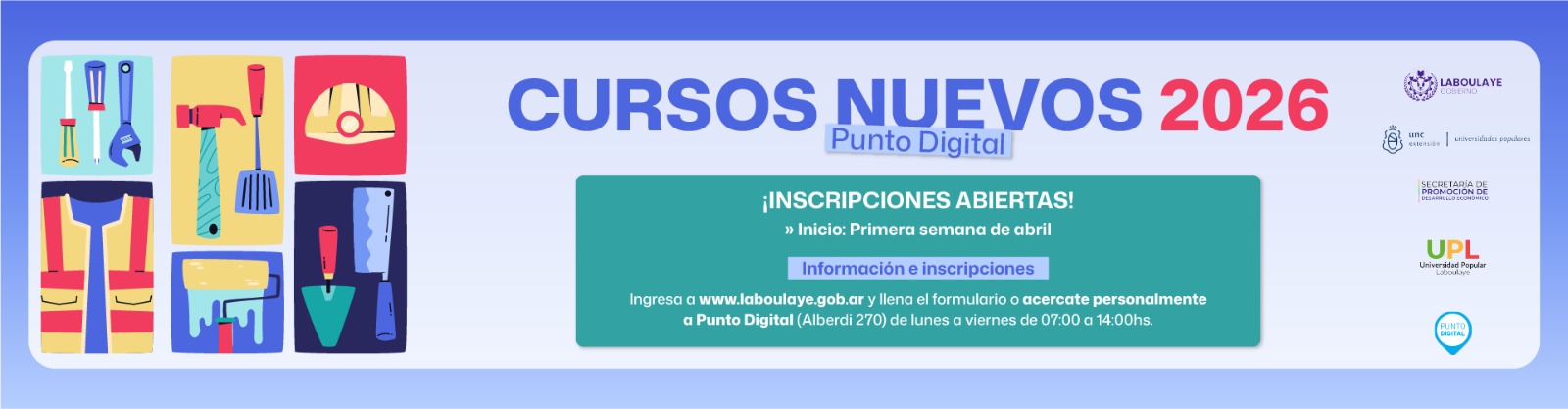 Completá el formulario o acercate personalmente a Punto Digital (Alberdi 270) de lunes a viernes de 07:00 a 14:00 hs. Cupos limitados.