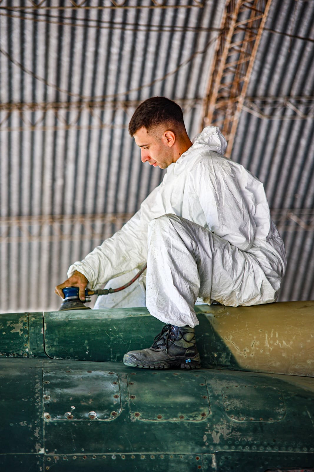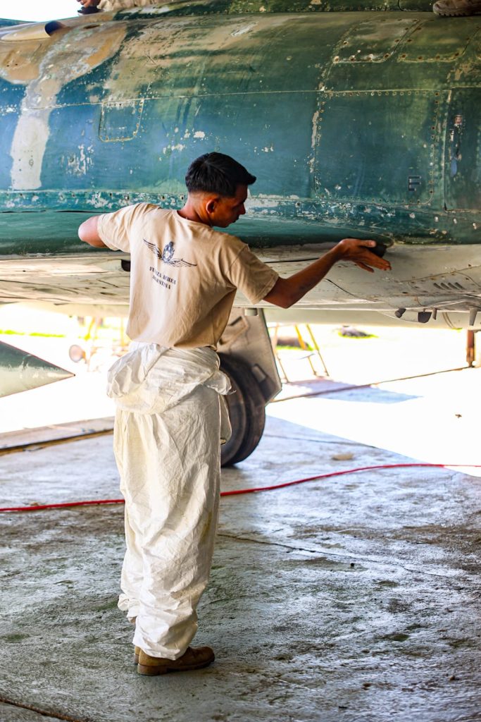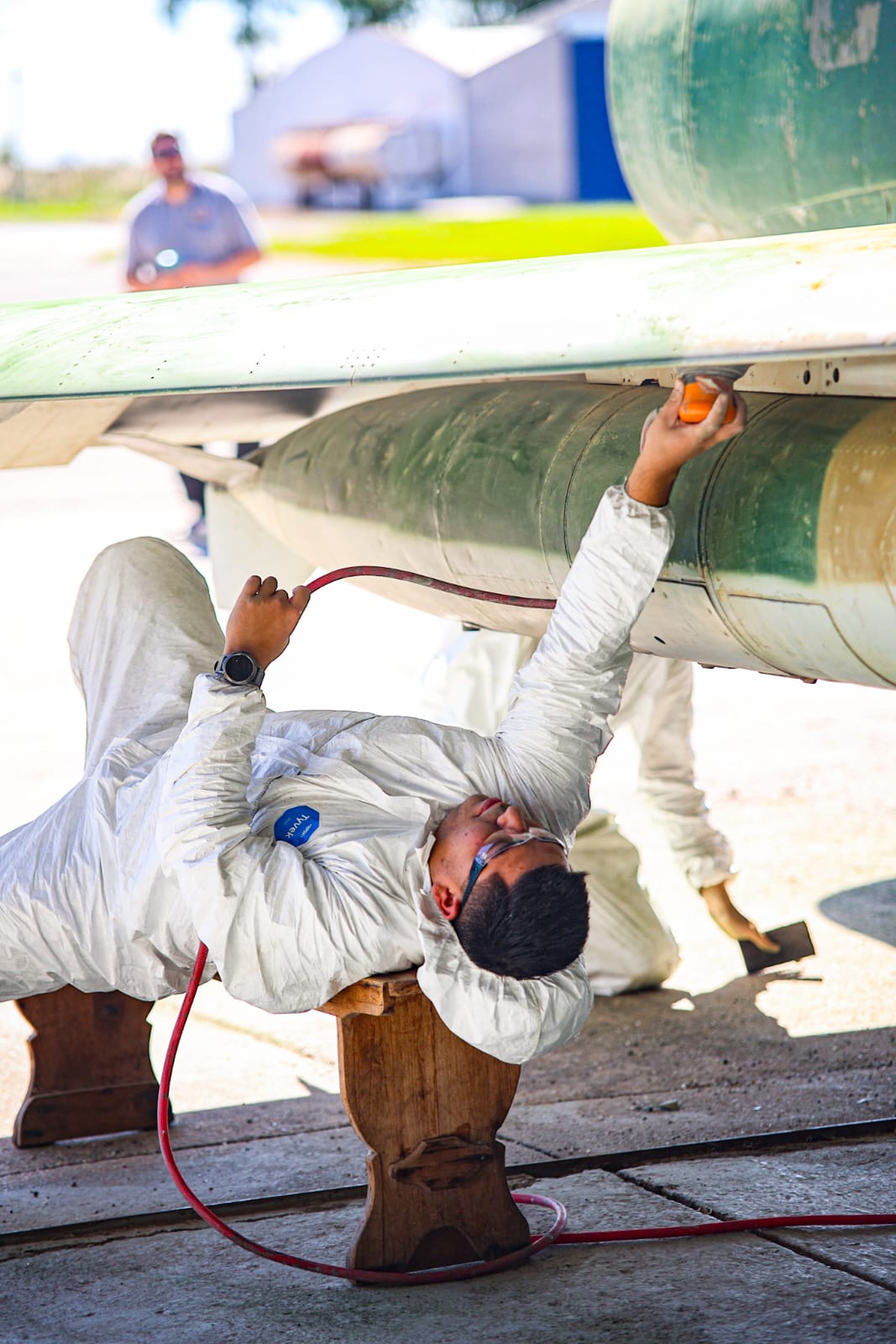 La aeronave, que llegó en el año 2017 en comodato con el aeroclub de nuestra ciudad, está siendo reacondicionada y pintada por miembros de la Fuerza Aérea Argentina, en un trabajo que busca no solo recuperar su aspecto original, sino también revalorizar su significado histórico de cara a la conmemoración del 1° de mayo.