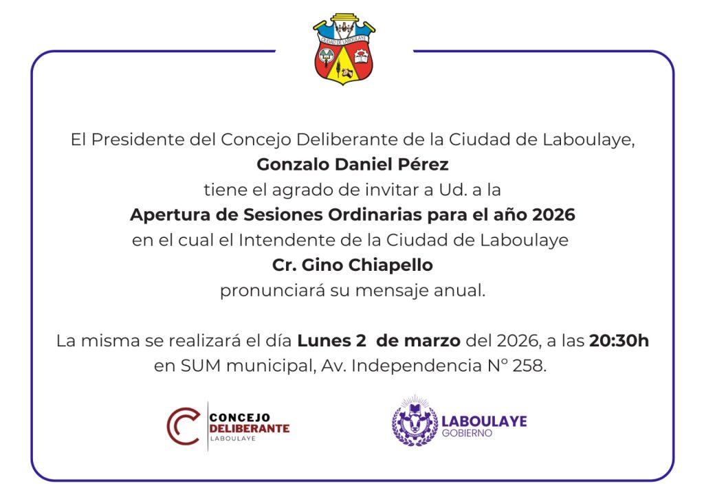 El presidente del Concejo Deliberante de Laboulaye, Gonzalo Daniel Perez, invita a participar de la Apertura de Sesiones Odinarias para el año 2026 en el cual el Intendente de la ciudad pronunciara su discurso anual.